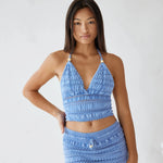 The perfect set for your next vacation! The Cosmo Crop Top is made from a high quality crochet cotton fabric. It features a coconut beaded halter front and open elastic back. Complete the look with the Cosmo Skort. Styling Tip: The beads on the front can be removed for a more subtle look.